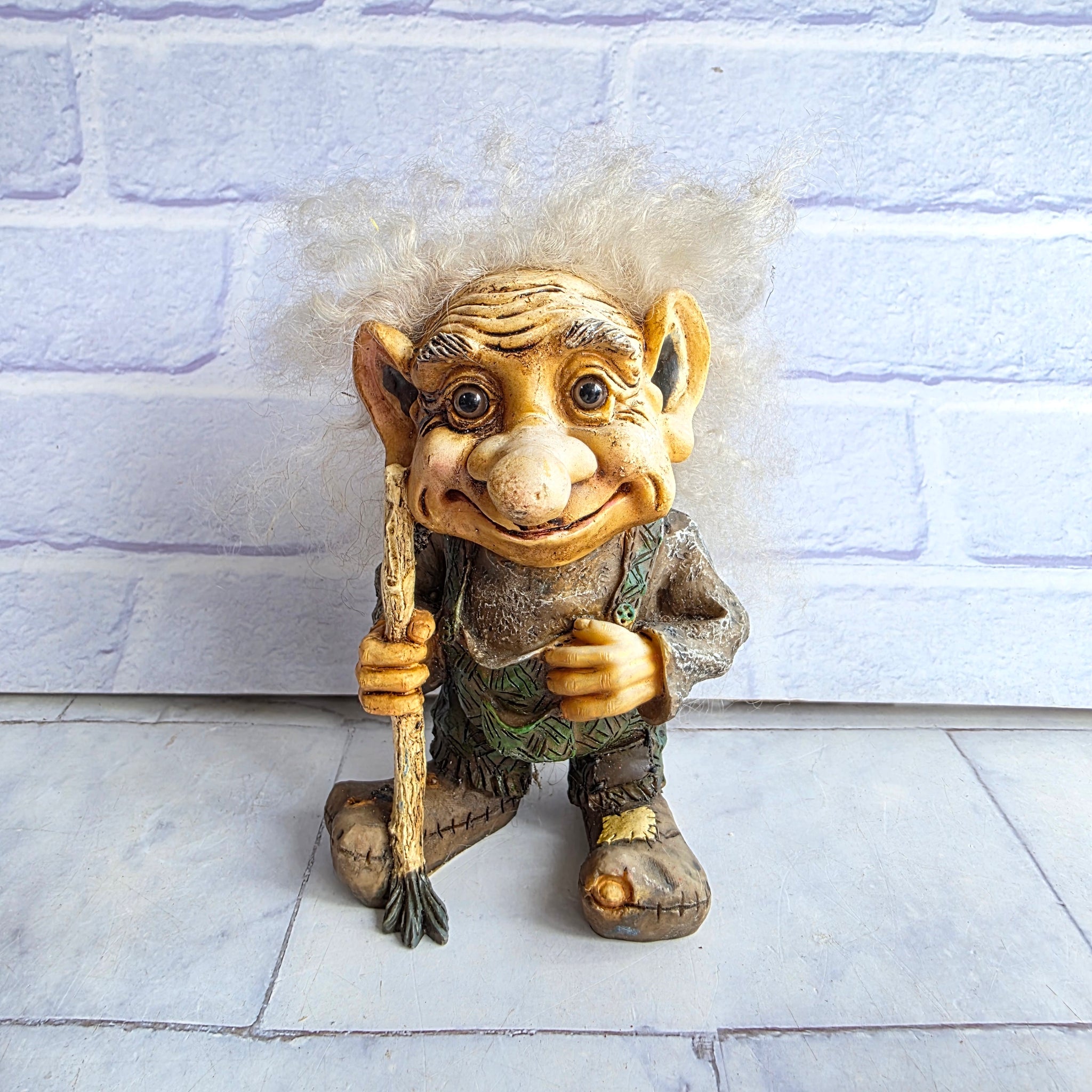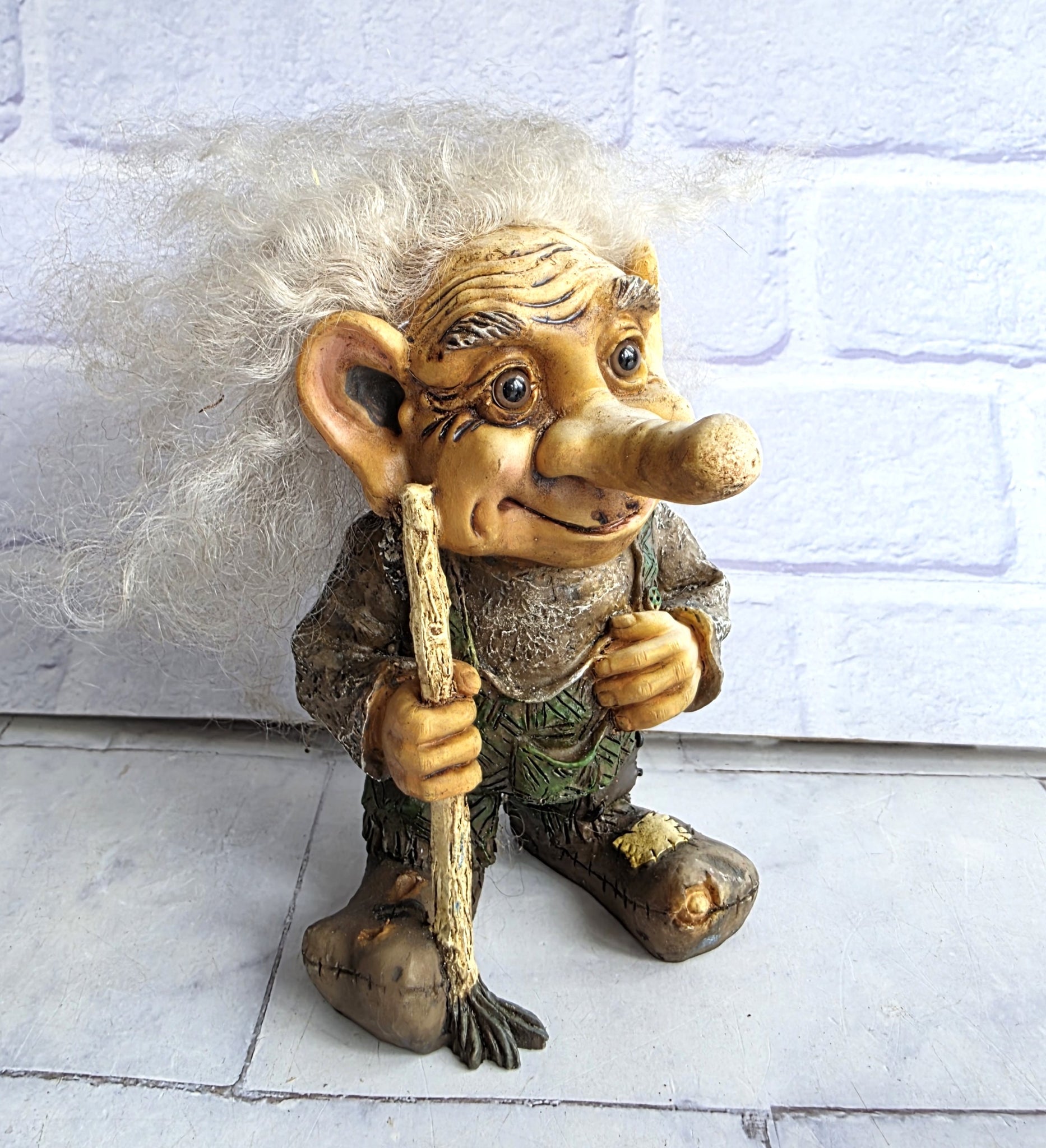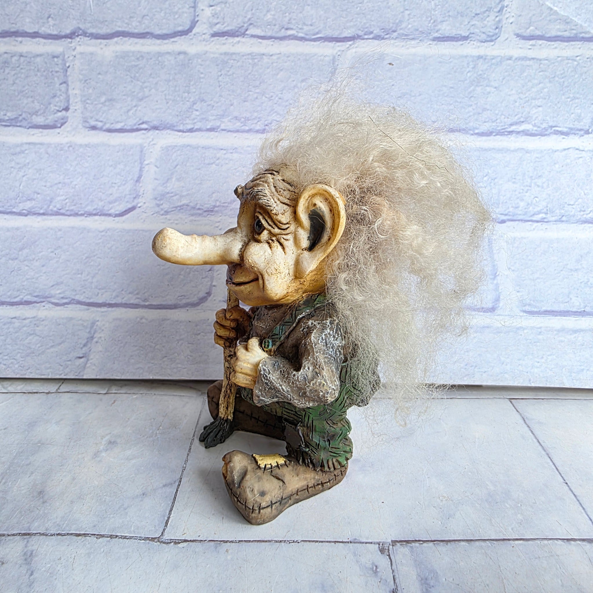 Vintage Allan Flink Nyform Troll with white hair and stick.